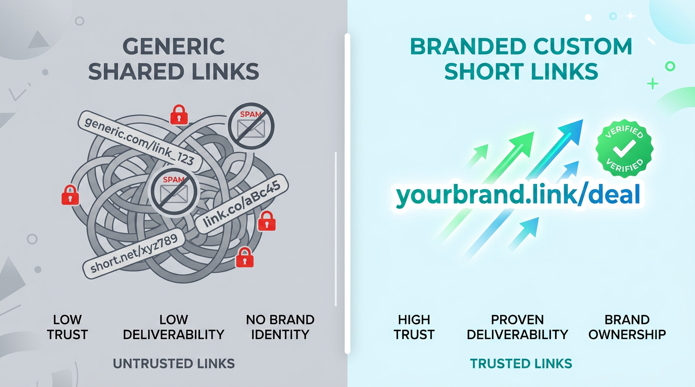 The most common argument for using generic shorteners is convenience: "I can shorten a URL in seconds without any setup." That is true for the first link. It is not true once you factor in the ongoing costs of poor deliverability, fragmented analytics, and brand dilution.