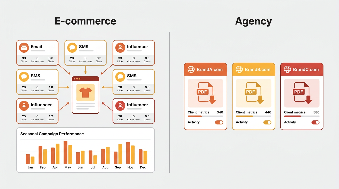 E-commerce marketing is characteristically multi-channel, multi-variant, and highly seasonal. A major brand might run simultaneous campaigns across email, SMS, paid social (Meta, TikTok), influencer partnerships, affiliate networks, and organic social - all pointing at the same landing page, all needing distinct attribution, all under time pressure.